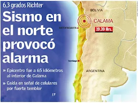 Aproximado 19:40, fuerte temblor en Calama 6.3 grados, si fue bien fuerte, aunque para la ciudad solo susto, se movía todo, y no paraba nunca; justo minutos antes estaba conversando con mi novia del chino que predijo varias cosas en una de esas anuncio de un gran terremoto para Chile con tsunami y muchos muertos, esto sale en el portal de Terra, y lo dijo el año pasado a fin de año, además comentabamos que decía que después de 15 a 20 días vendría una replica muy fuerte, y de repente se nos mueve todo.