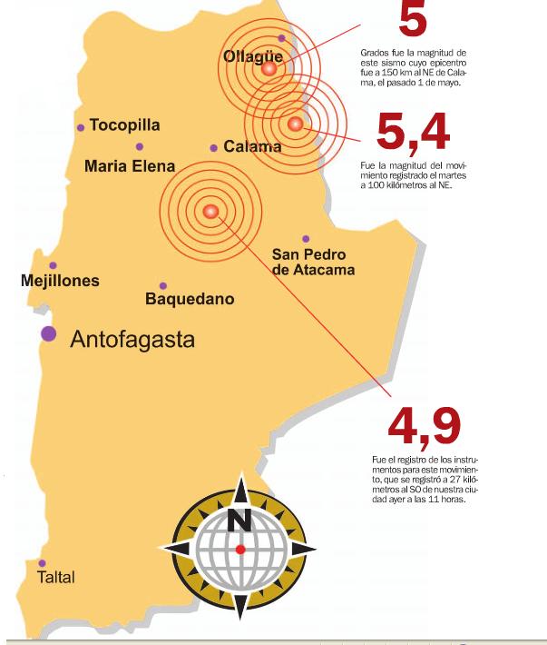 El último de los cuales ocurrió en la región de Arica y Parinacota a las 10:51 horas, con una magnitud 4,1 Richter. El epicentro se registró a 43 kilómetros al oeste de Arica.