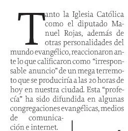 En fin, este megaterremoto para la zona norte se viene mencionando desde que tengo recuerdo, y eso que tengo mis años, y lo más gracioso que cuando sucedía un terremoto fuerte siempre decían, "pero este no es el megaterremoto", la comunidad en vez de darle un consuelo quedan más asustados ya que si no fue ese, como será el megaterremoto que siempre se anuncia.